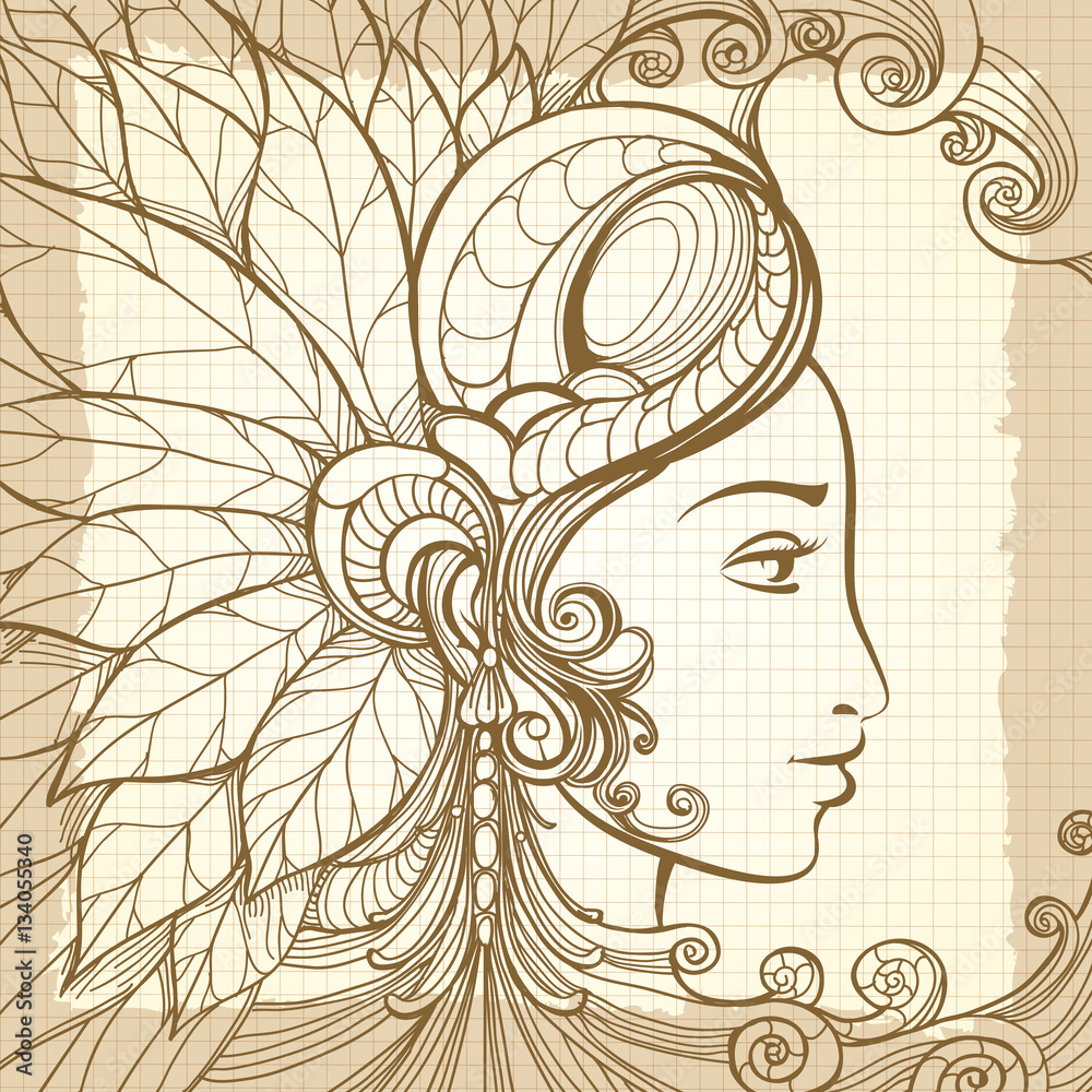 Fotografie Zentangle woman face and decorative elements on notebook background