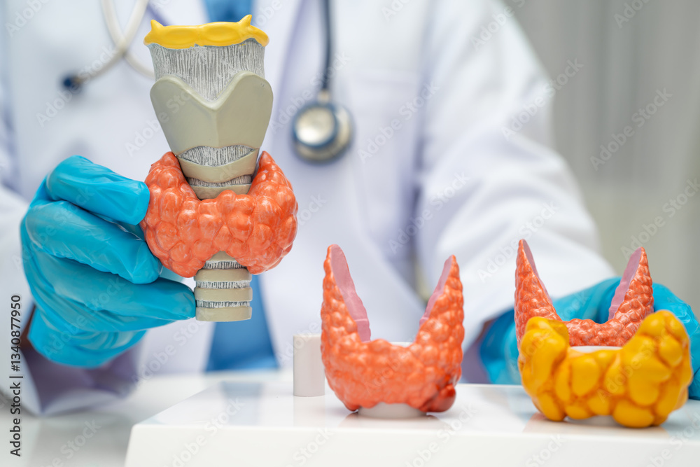 Fotografie Hyperthyroidism, Overactive Thyroid, Thyroid Lymphoma, Asian doctor with thyroid gland human anatomy model in hospital