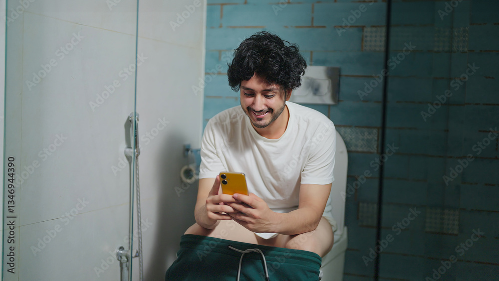 Fotografie Indian Asian active young adult gen z happy man guy sitting on toilet use mobile