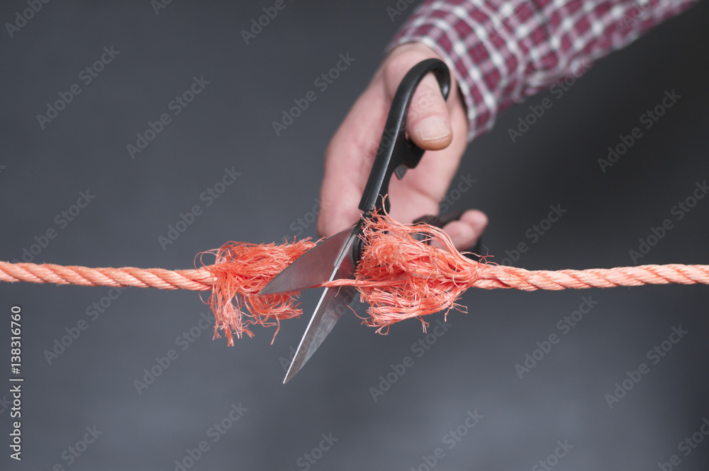 Fotografie Rotes Seil wird zerschnitten / Rotes Seil wird mit einer Schere zerschnitten