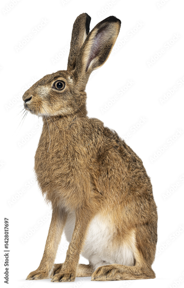 Fotografie European hare sitting and looking up, isolated on transparent background
