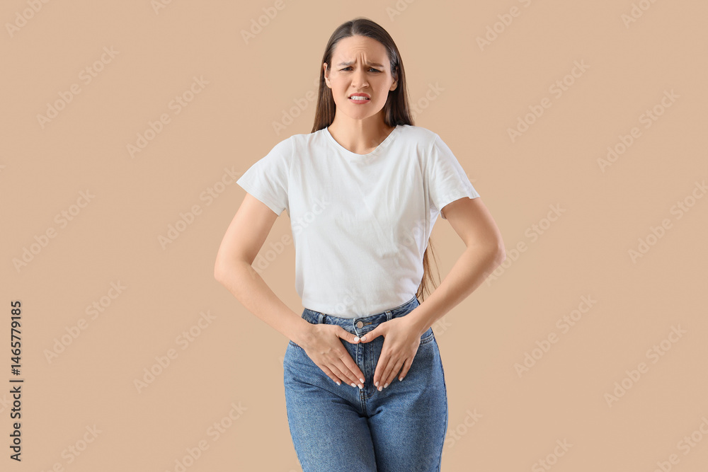 Fotografie Young woman suffering from menstrual cramps on beige background