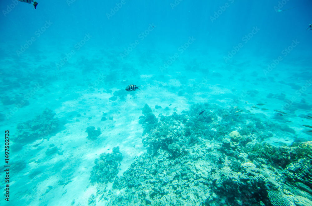 Fotografie Turquoise sea bottom with scattered corals scattered across sandy seafloor