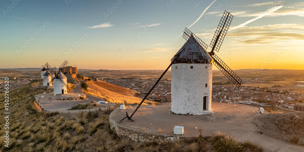 Fotografie Aerial view of the historic windmills of Consuegra at sunrise, Castilla-La Manch