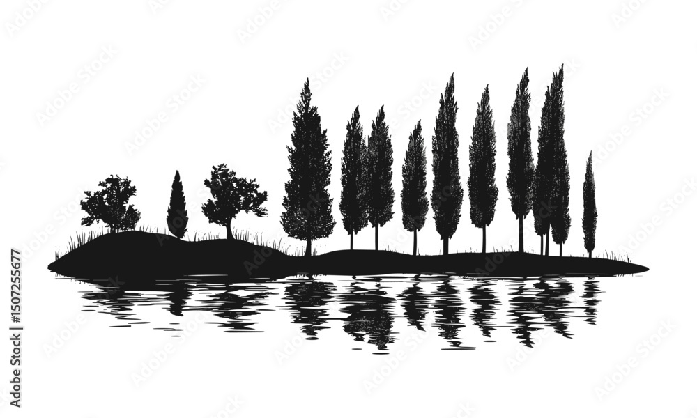 Fotografie Breezy poplar tree silhouettes, tall thin trees by reflective water, calm forest nature design, engraved trunk vector illustration, tranquil lakeside valley, scenic outdoor environment