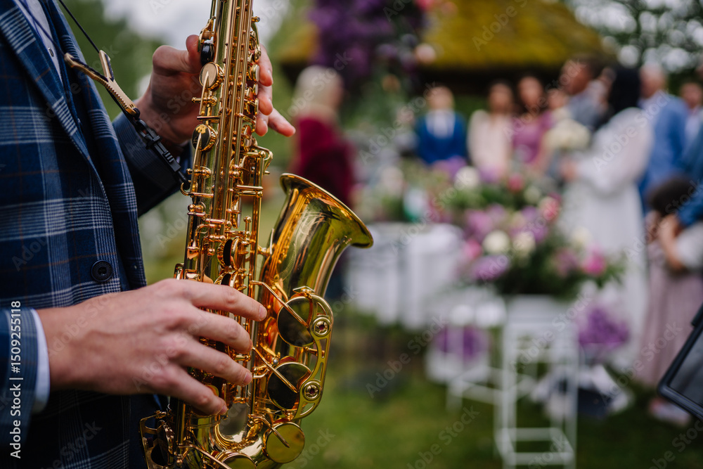 Fotografie Close-up of a saxophonist playing at an outdoor wedding ceremony, with blurred guests, flowers, and decorations in the background