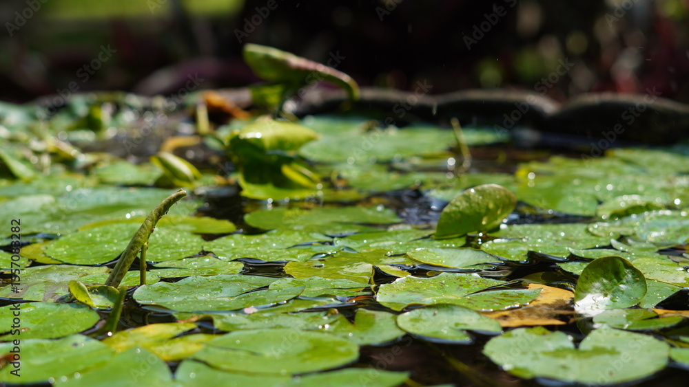 Fotografie Fresh green water lily leaves on a peaceful pond surface, glistening under natural sunlight