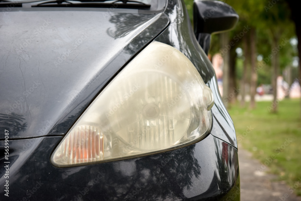 Fotografie Damaged and blurred headlight surface as a result of weather con