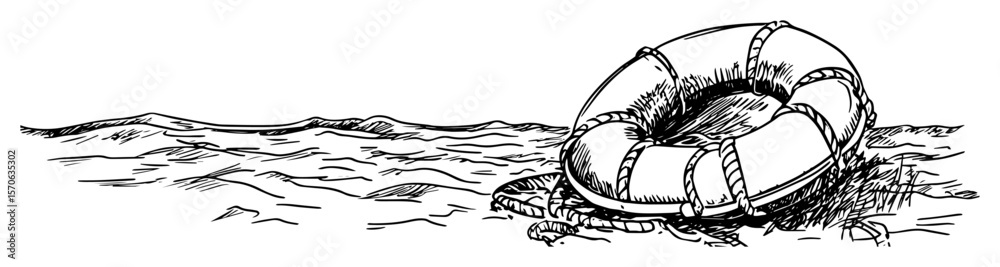 Fotografie lifebuoy drifting in waves line art vector illustration