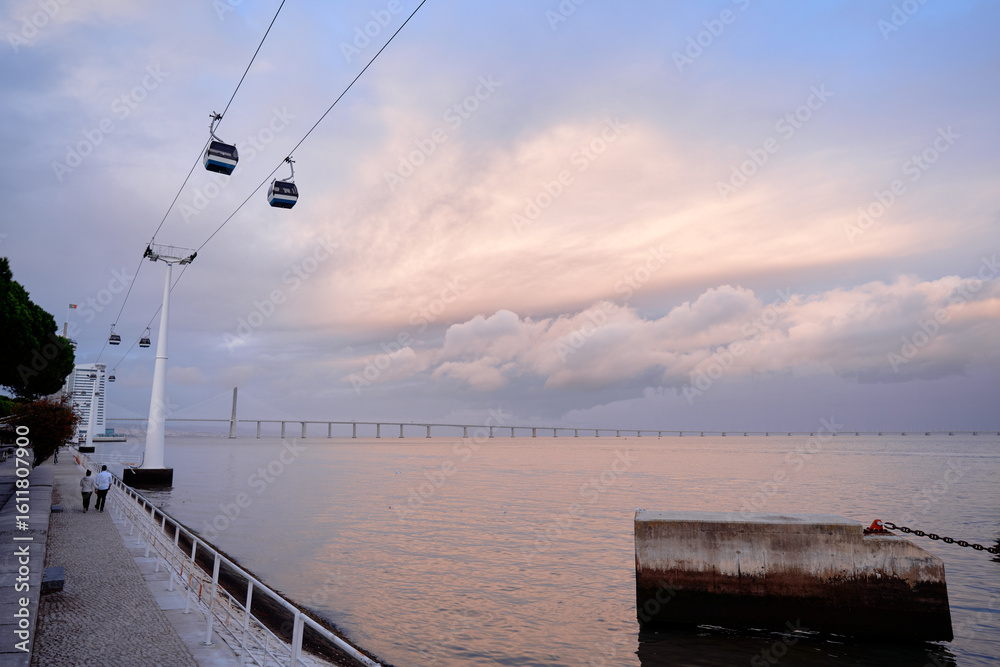 Fotografie A scenic view of a waterfront promenade with a cable car system overhead, trees lining the walkway, and a calm sea under a cloudy sky