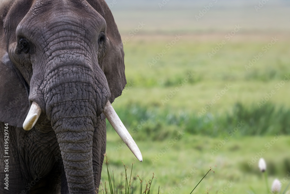 Fotografie Close up view of large African Elephant at Ngorongoro crater, Tanzania with copy space