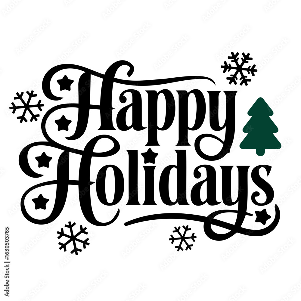 Fotografie Happy holidays text with decorative flourishes stars snowflakes and a green chri