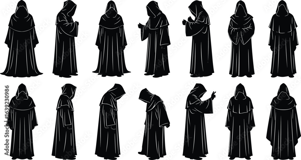 Fotografie Dark hooded monk silhouette collection, mysterious cloaked figures, medieval rob