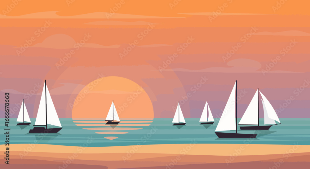 Fotografie Seascape at sunset features several sailboats silhouetted against an orange sky