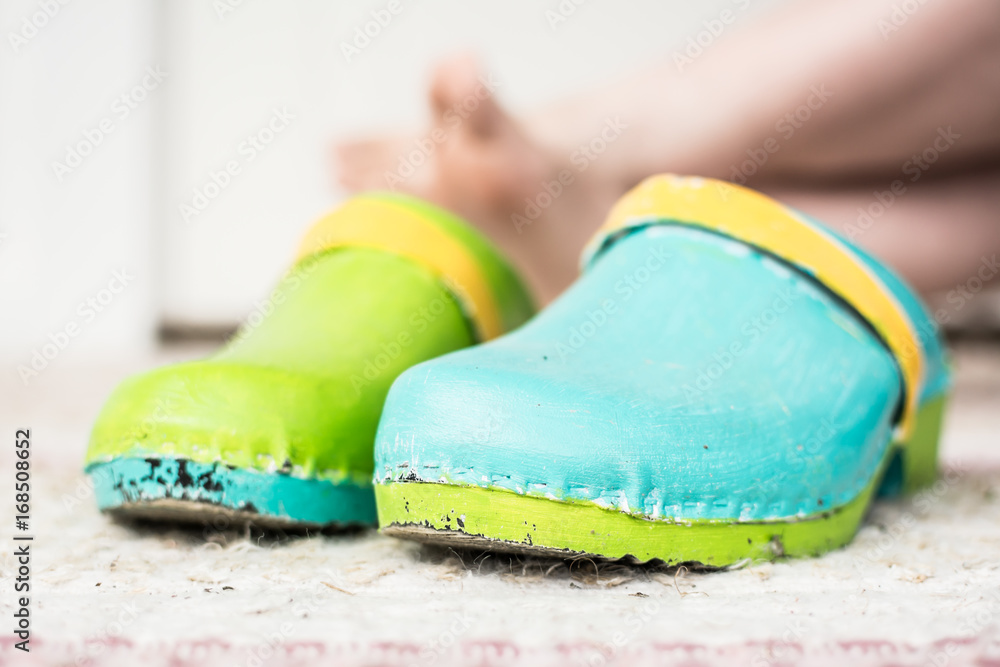 Fotografie Pair of green, blue and yellow painted clogs with bare feet visible in the background