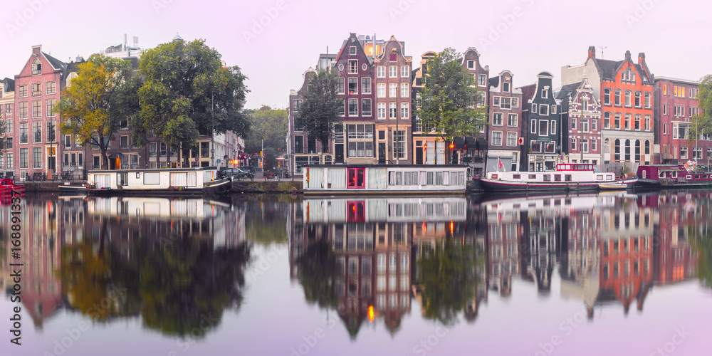 Fotografie Panorama of Amsterdam canal Amstel with typical dutch houses and houseboat from the boat in the morning, Holland, Netherlands