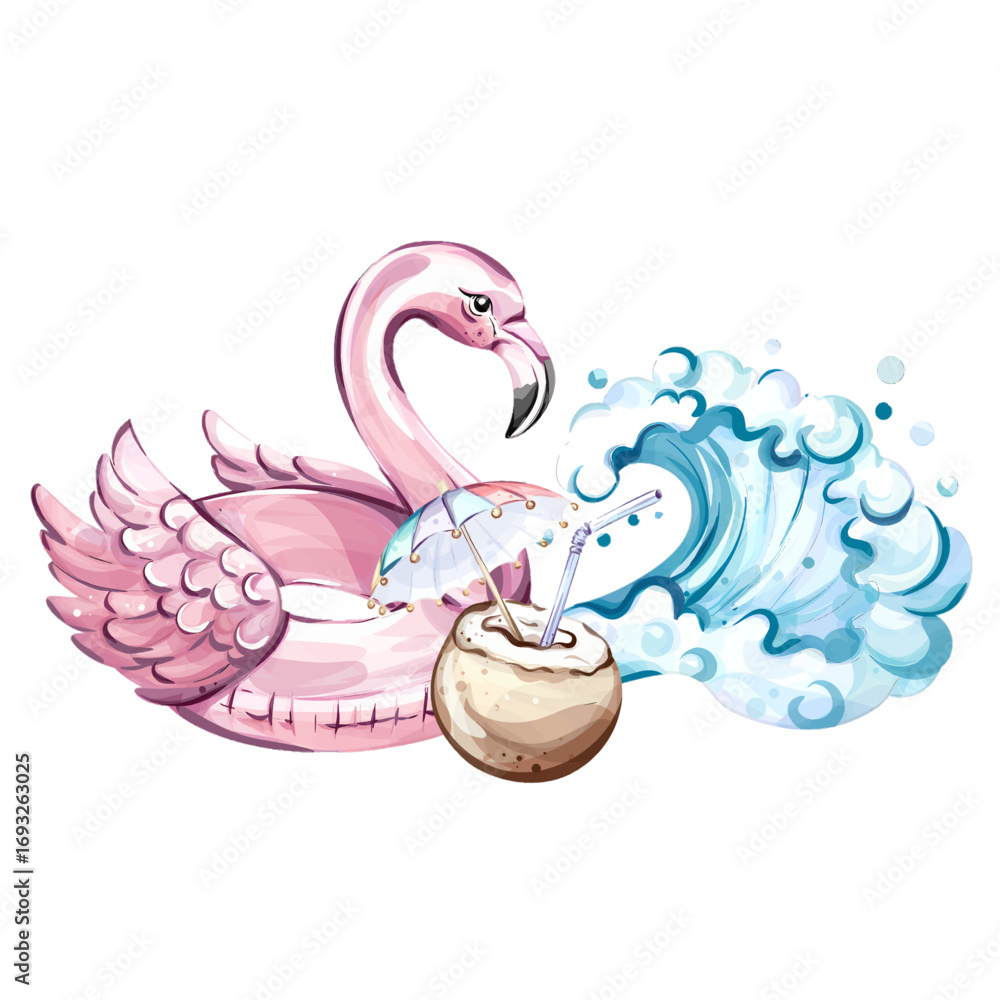 Fotografie Enjoy summer relaxation with a pink flamingo float, coconut drink, and playful w
