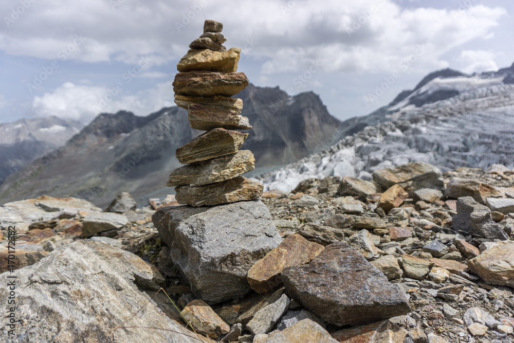 Fotografie A beautiful cairn with mountains and a glacier in the background in the alps of switzerland