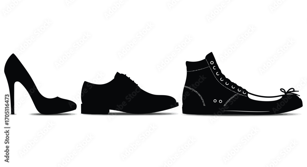 Fotografie Diverse footwear collection showing silhouette of high heel shoe dress shoe and