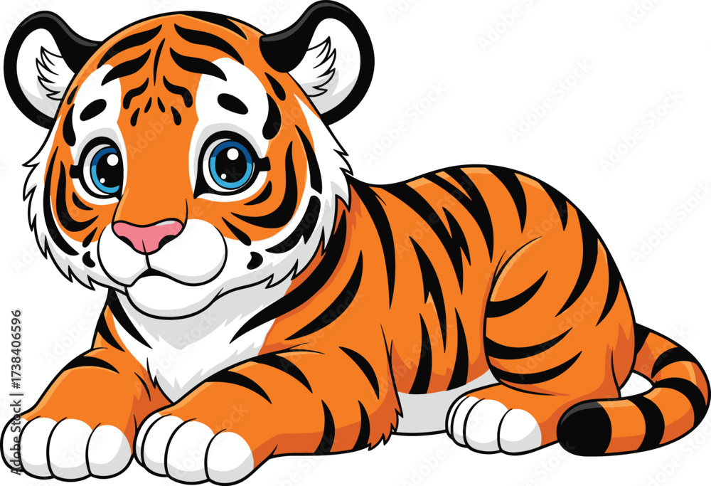 Fotografie Cute cartoon baby tiger lying down with blue eyes, orange fur, black stripes, ad
