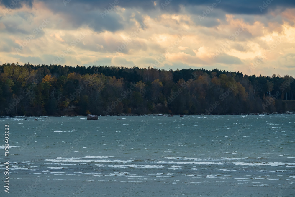 Fotografie The rugged Estonian coastline with a colorful autumn forest meets the choppy waters of the Baltic Sea under a dramatic sky