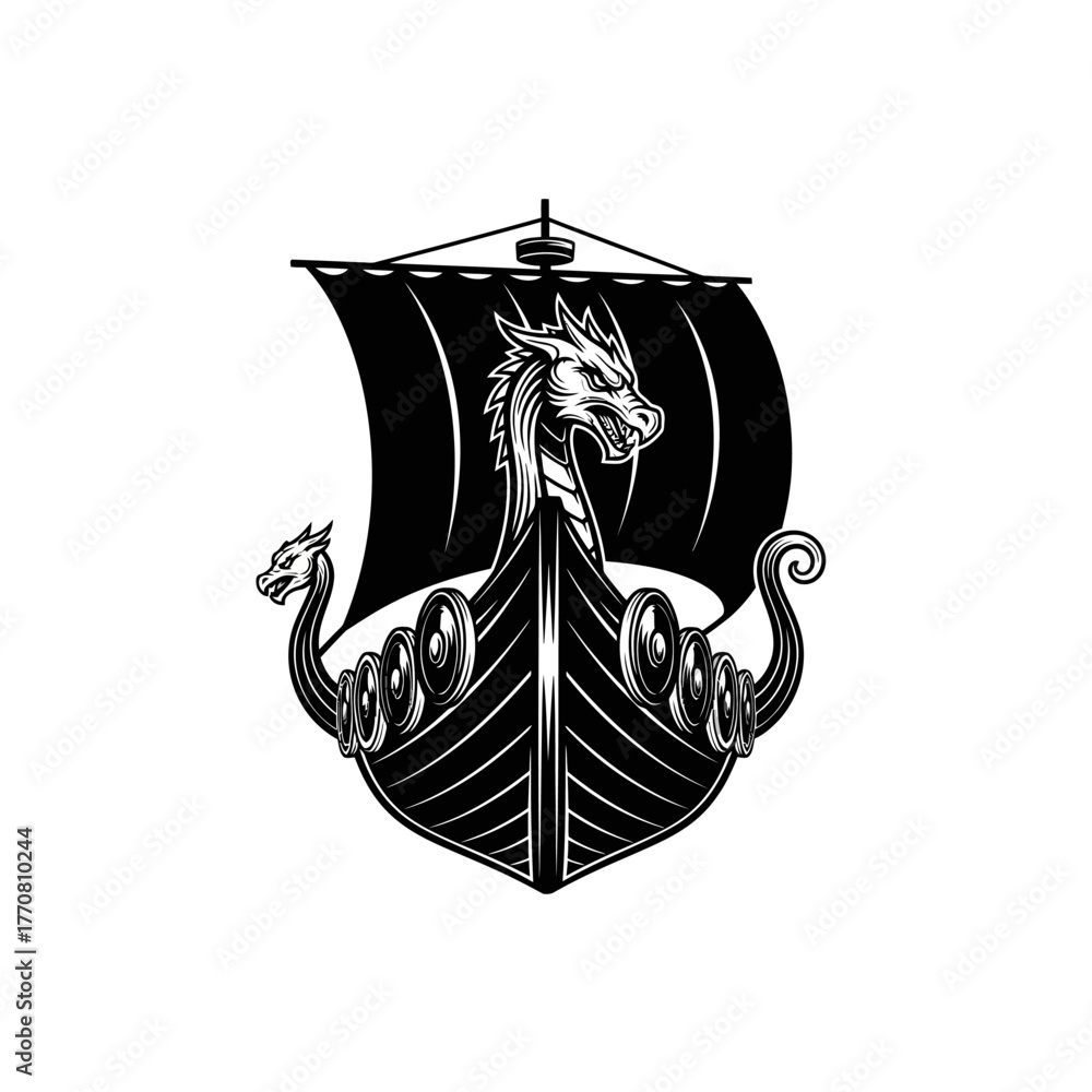 Fotografie Monochrome Viking longship with a dragon head prow illustration.