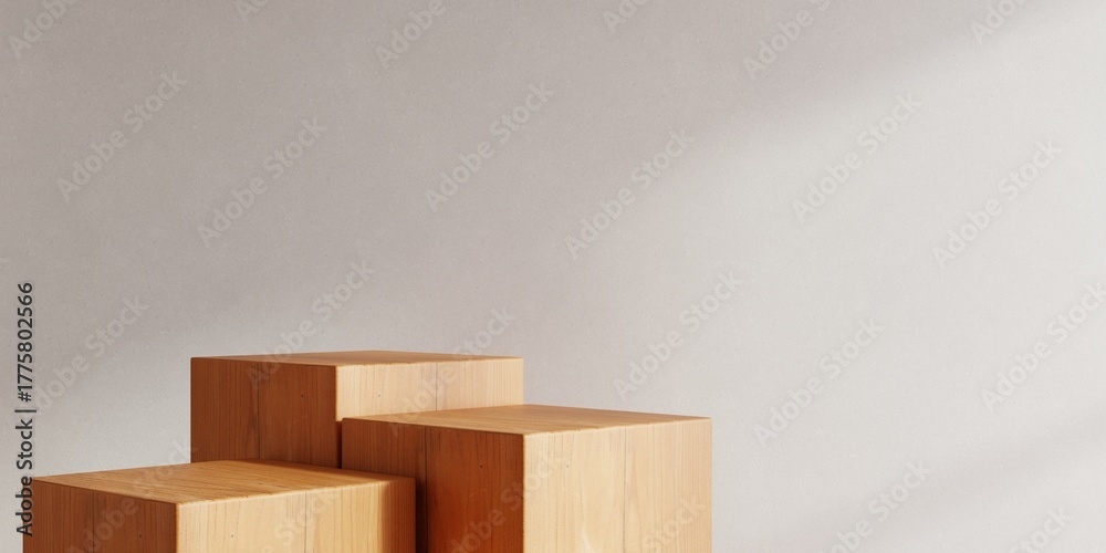 Fotografie Minimal design scene with wooden cube podiums arranged in steps on a neutral bac