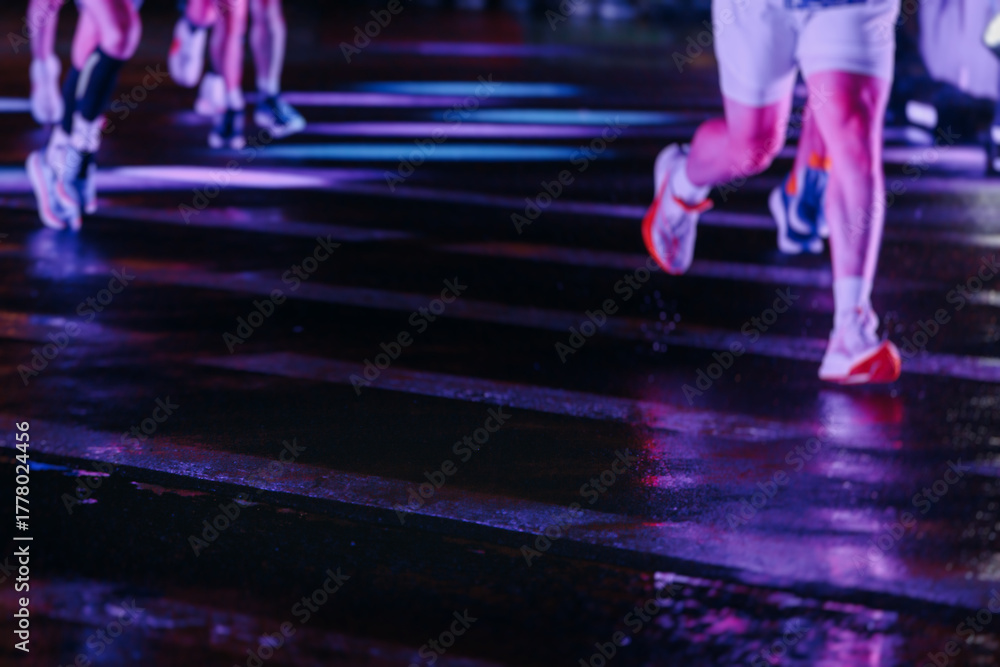 Fotografie Night marathon runners crowd in the rain, sportsmen participants start running t