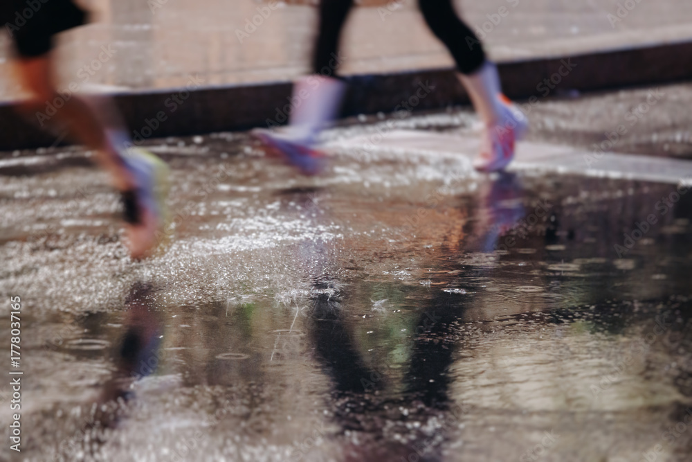Fotografie Night marathon runners crowd in the rain, sportsmen participants start running t