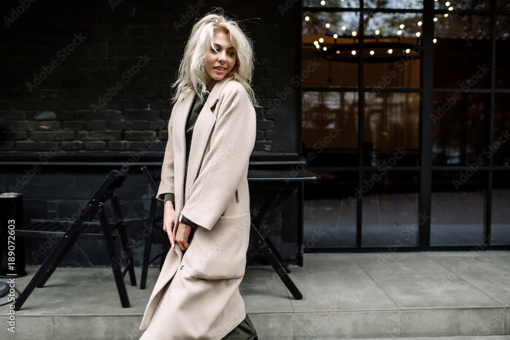 Fotografie Portrait of beautiful young stylish blonde woman wearing beige coat and walking through the city streets