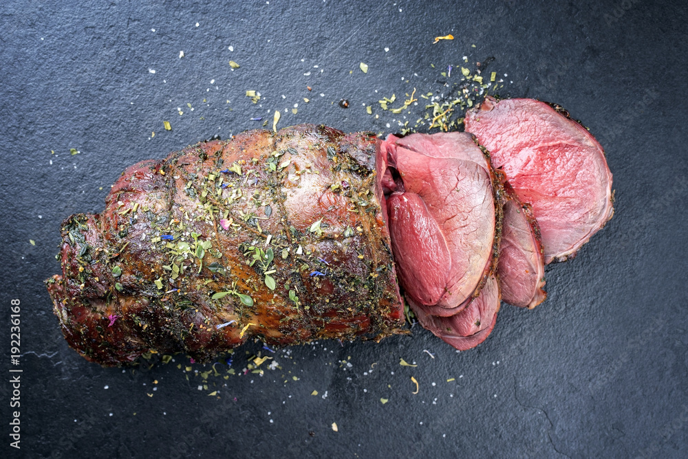 Fotografie Barbecue dry aged haunch of venison with herbs as close-up on a black board