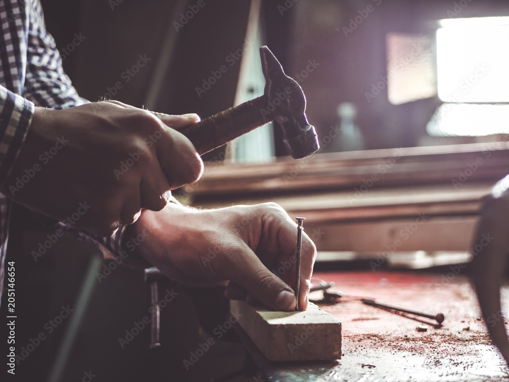 Fotografie close up hammering a nail into wooden bar on the table