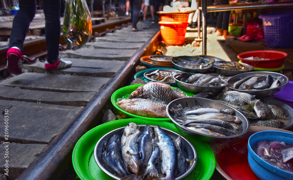 Fotografie Selling food on the Maeklong Railway market in Thailand