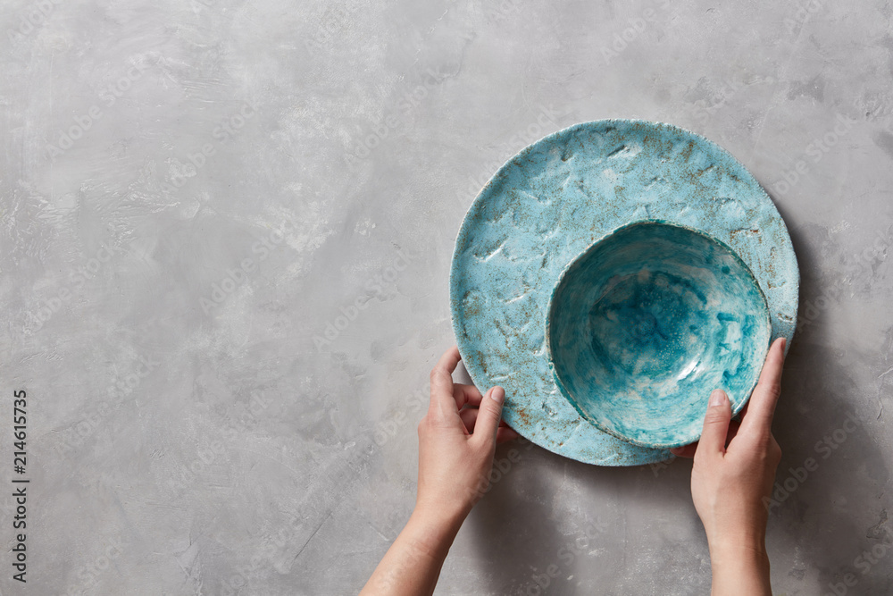 Fotografie Vintage painted glazed plates dishes on gray concrete table with free space ror text
