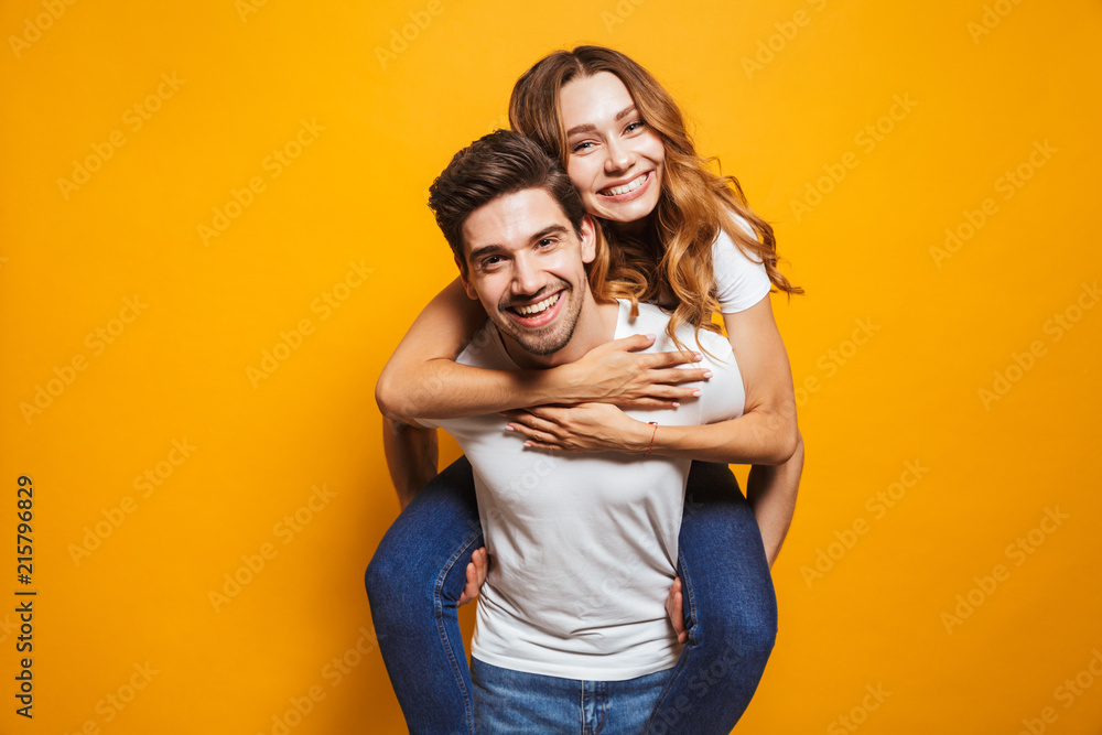 Fotografie Image of lovely couple having fun while man piggybacking his girlfriend, isolate