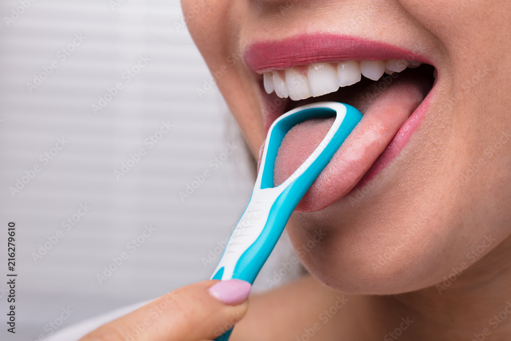 Fotografie Woman Cleaning Her Tongue With Cleaner
