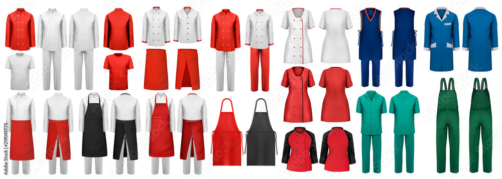 Fotografie Mega set of overalls with worker and shefcooks and medical clothes