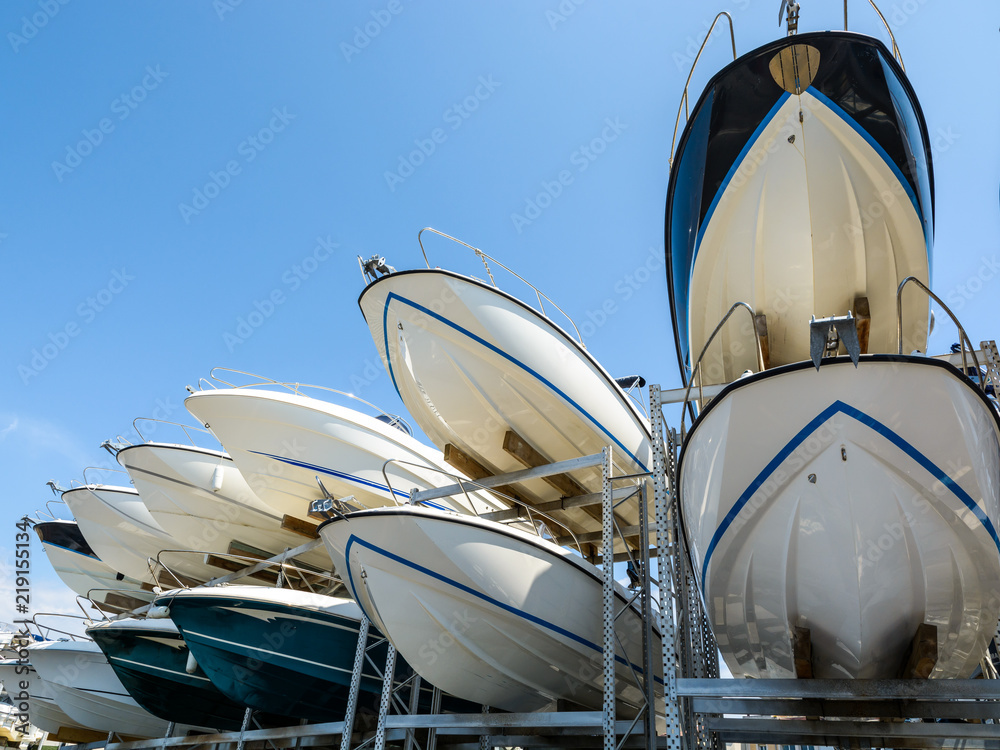 Fotografie View from below of the hulls of motorboats racked one above another on two levels in a dry rack boat storage facility against blue sky