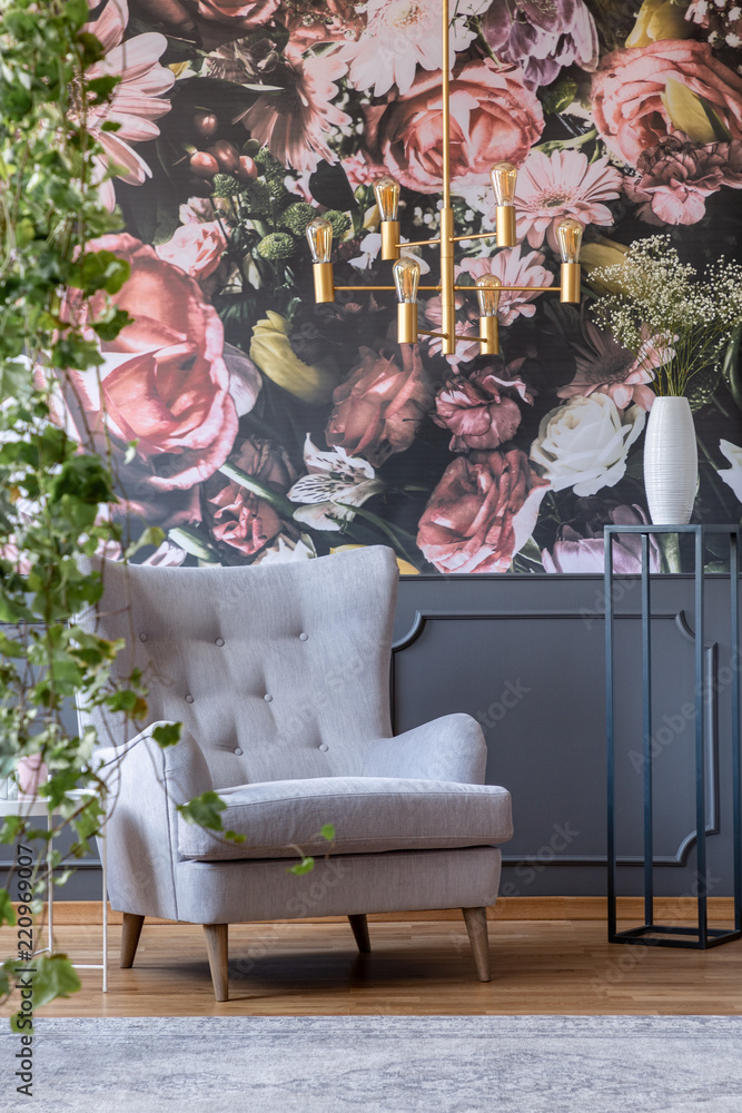 Fotografie Gold chandelier above grey armchair in living room interior with flowers wallpaper