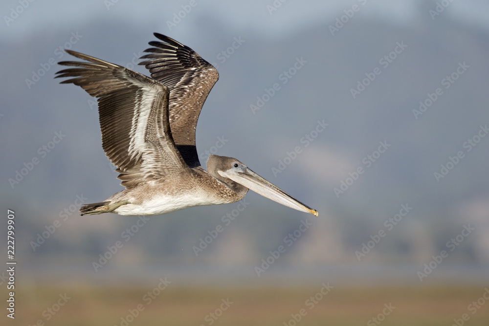 Fotografie A brown pelican (Pelecanus occidentalis) in flight at Moss landing California