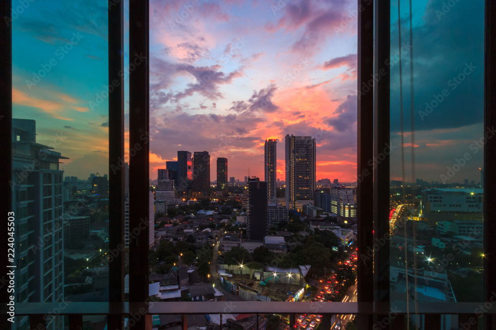 Fotografie Glass window in room with view at beautiful sunset