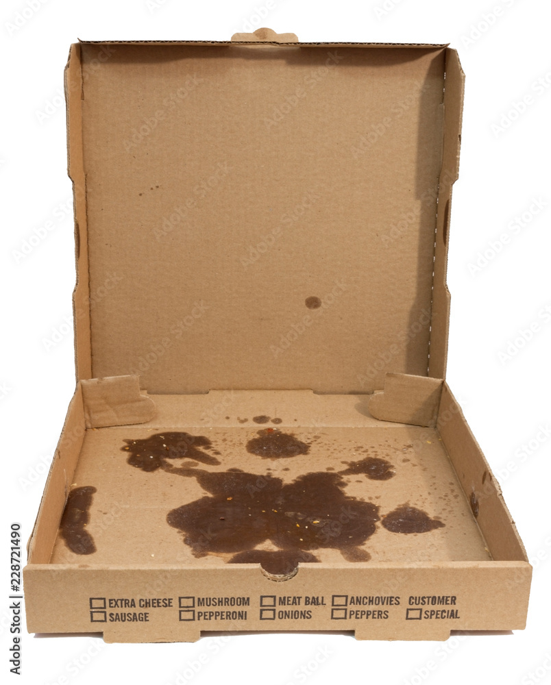 Fotografie Empty greasy pizza box with lid open. Isolated.