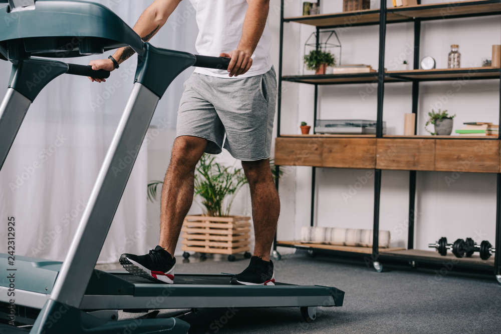 Fotografie cropped view of man workout on treadmill in living room