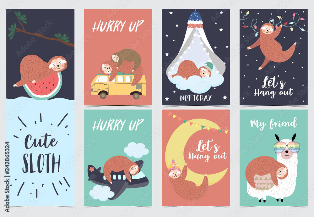 Fotografie Hand drawn cute card with sloth,orange,watermelon,tree,llama,bed,moon and airpla