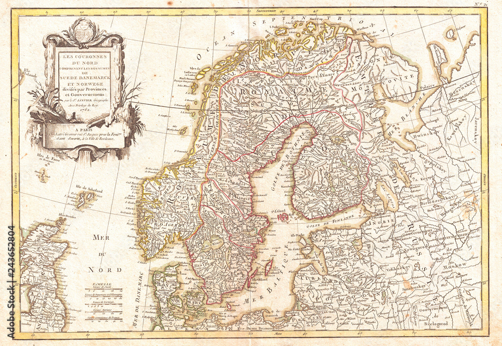 Fotografie 1762, Janvier Map of Scandinavia, Norway, Sweden, Denmark, Finland