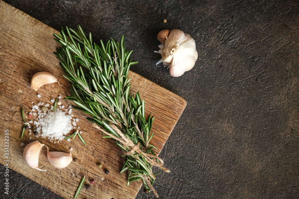 Fotografie Fresh rosemary herb, scab and spices on a dark background copy space top view