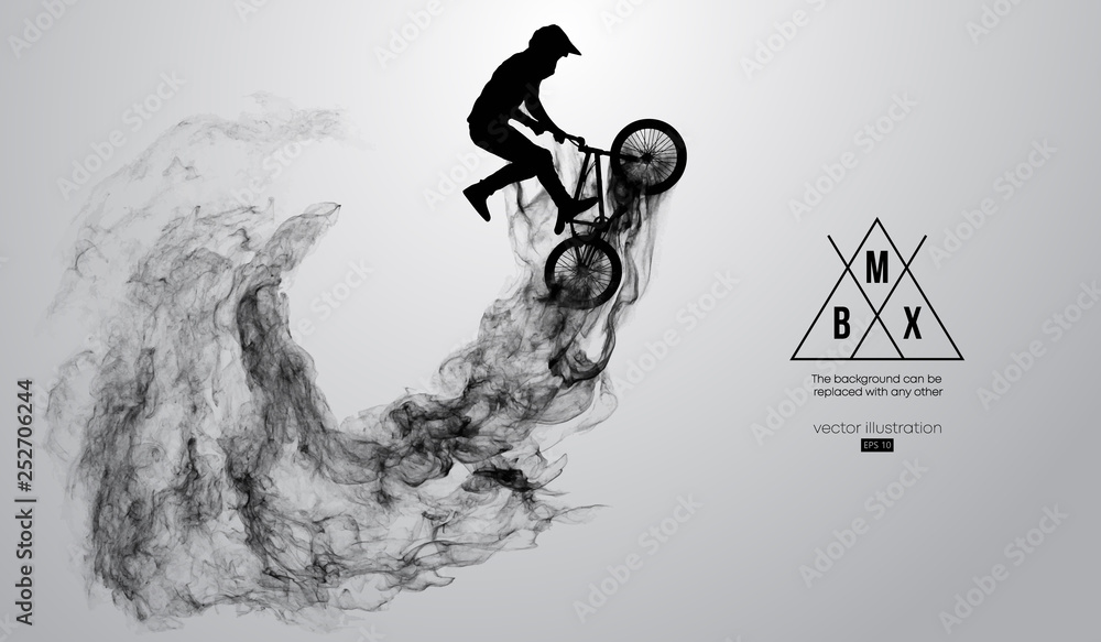 Fotografie Abstract silhouette of a bmx rider on the white background from particles, dust, smoke, steam