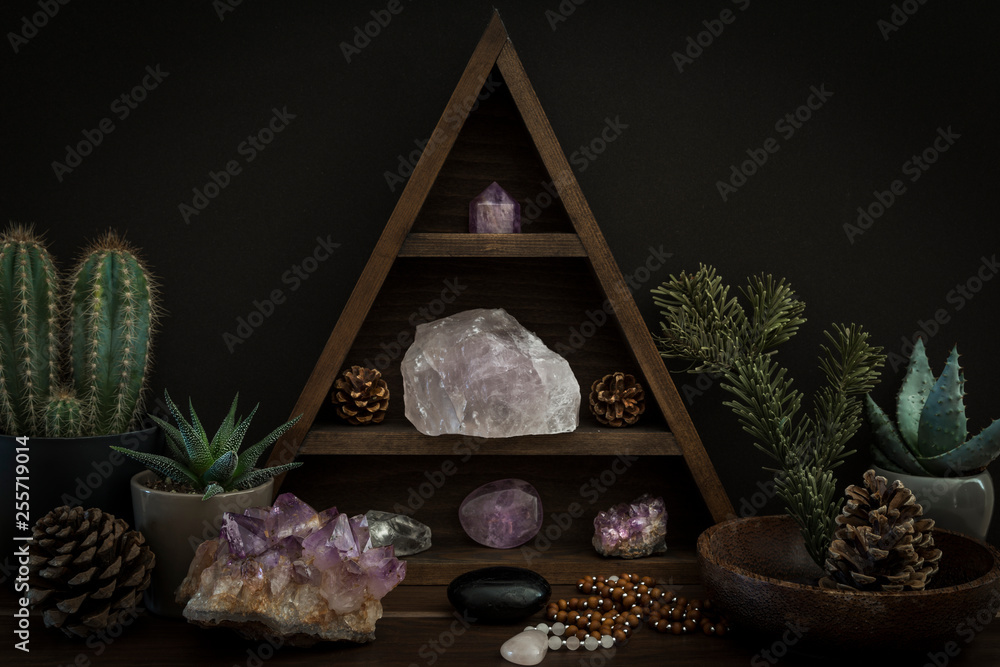 Fotografie Triangular Crystal Shelf with Plants Foliage Gems and Jewellery on a Wooden Surf