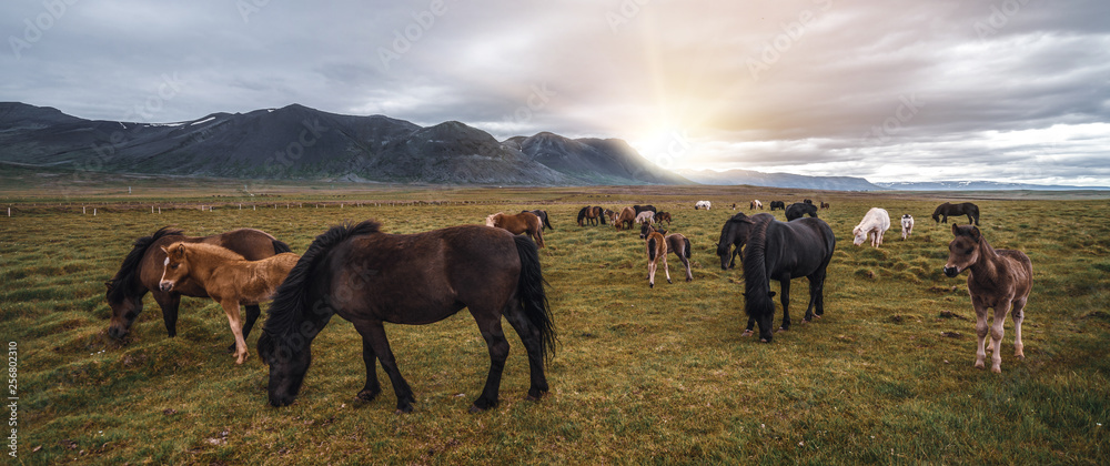Fotografie Icelandic horse in the field of scenic nature landscape of Iceland