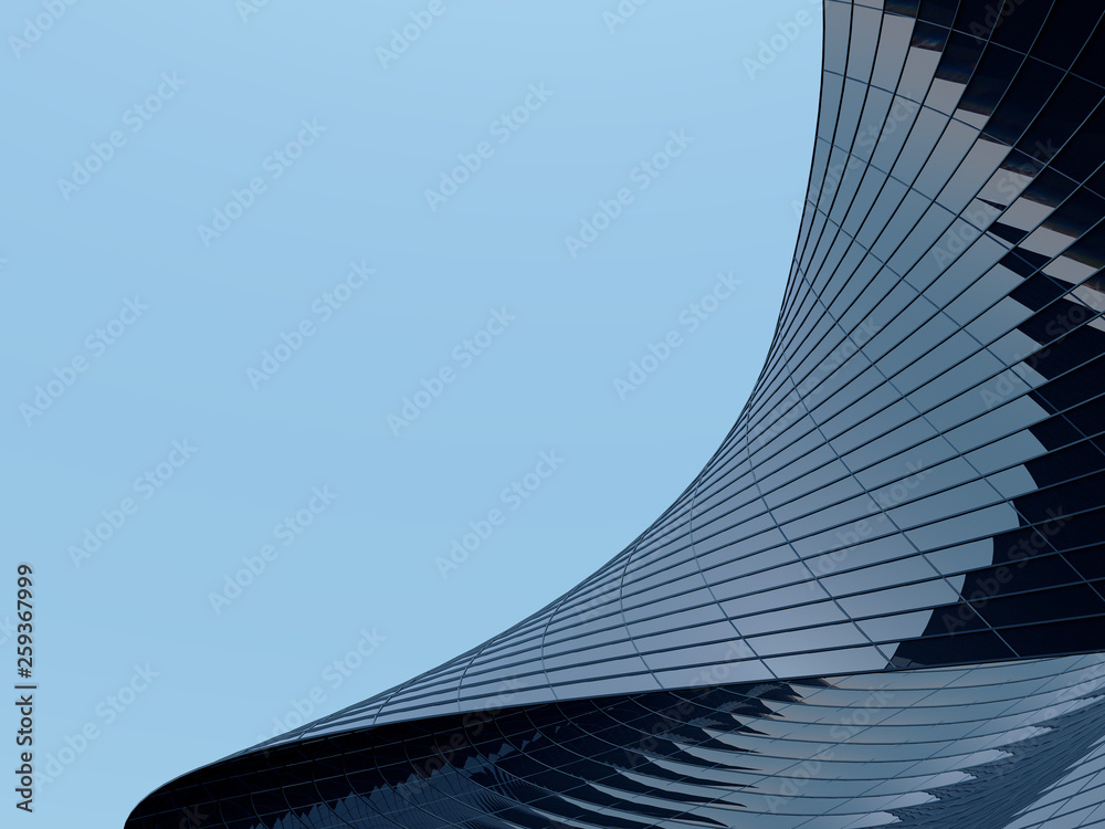 Fotografie 3D stimulate of high rise curve glass building and dark steel window system on blue clear sky background,Business concept of future architecture,lookup to the angle of the corner building